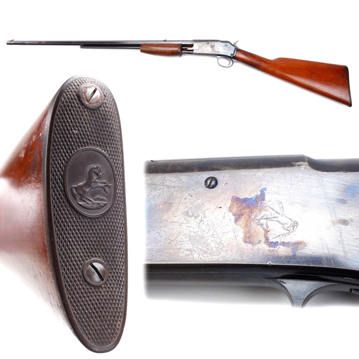 Made on a handy take-down action, buyers had the option of ordering this rimfire with a short 16 inch "Bicycle Rifle" barrel. Only about 125,000 were made in a production run from 1897 to 1922 before being replaced with the Model 39.
